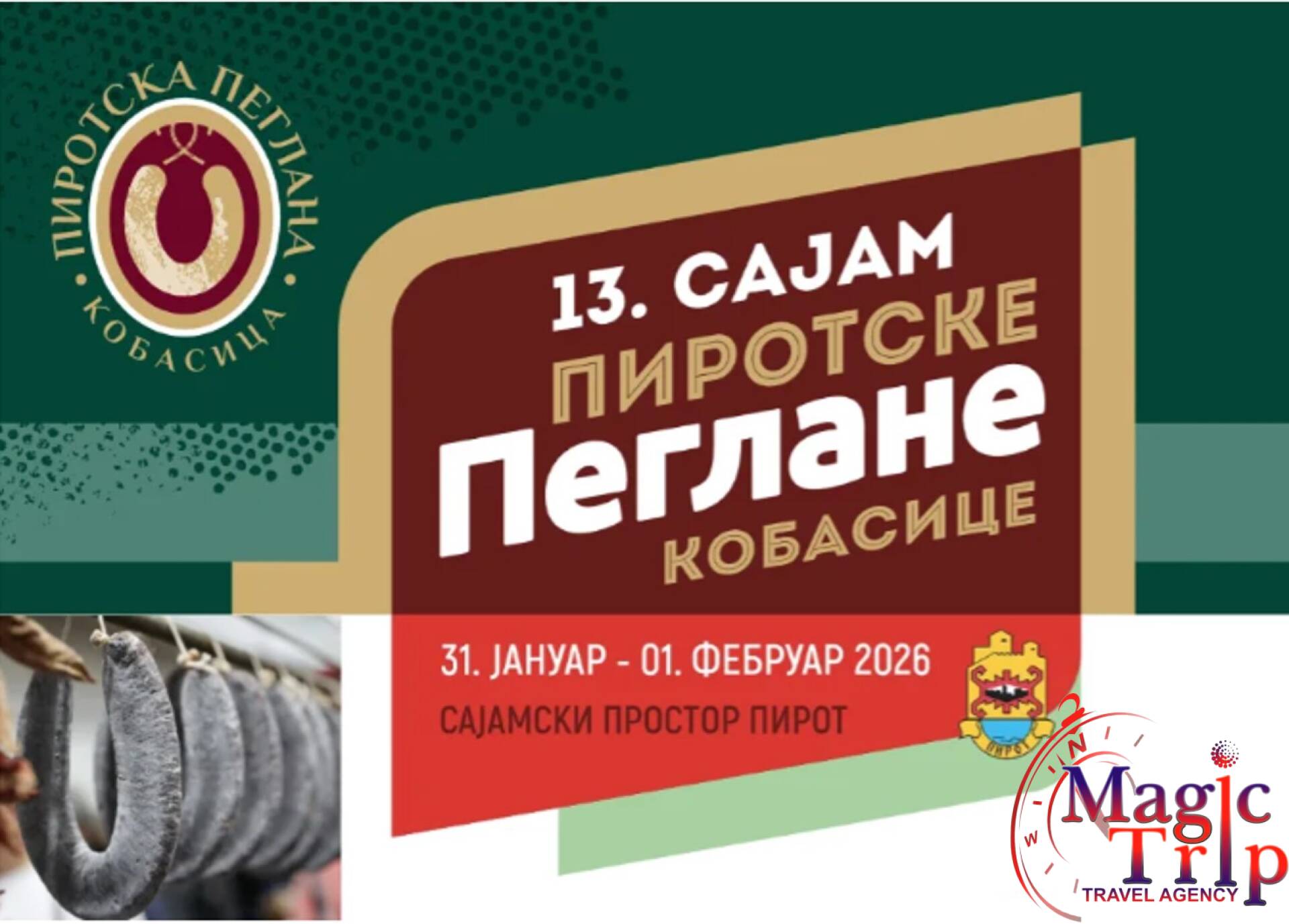 Първи ден - Отпътуване рано сутринта към гр. Пирот. Посещение на Фестивал Пеглана Кобасица. Този вид колбас е произведен от най-висококачествени меса, смесени с пикантни подправки. Колбасицата се произвежда още от времето на Османската империя. За Пеглана колбасица се използват внимателно подбрани парчета от козе, овче и говеждо месо, без свинско. Пеглана колбасица трябва да се консумира гореща, за да може да се усети специфичният вкус на подправките. През периода на съхнене, колбасите на всеки два дни се пресоват, ето защо този вид наденица се нарича Пеглана колбасица (пресована, изгладена) и по този начин се оформя като подкова. Свободно време. Разходка из центъра на града. Настаняване в хотел Етно село Срна.